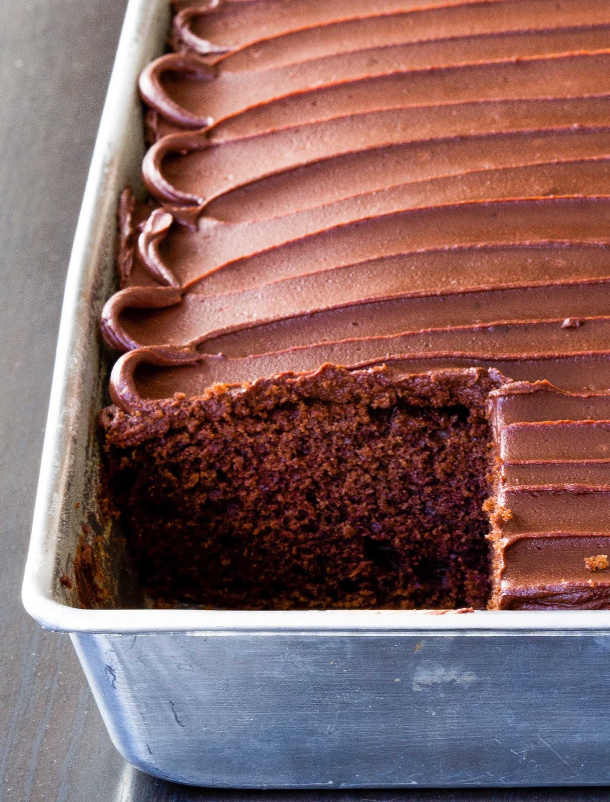 The chocolate frosting, however, is pure decadence. It perfectly balances more refined nature of the cake. Cover the whole pan with a thick layer of this frosting and serve slices right out of the pan.